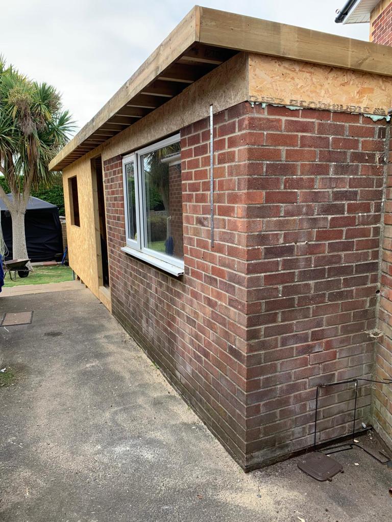 The existing roof was removed from the outbuilding, allowing us to connect the timber frame to the brick, and then fit a new flat rubber roof with vented soffits to provide airflow.