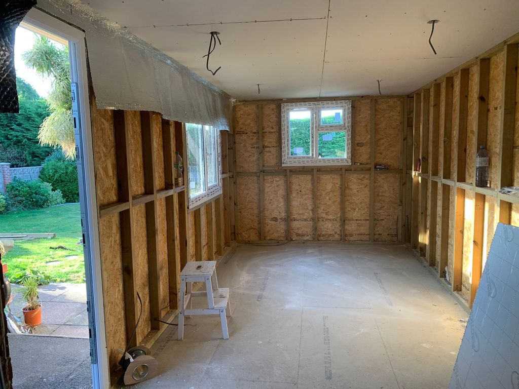 Once we had fitted the windows, door, insulation, and all the required electrical feeds, we installed the plasterboard ready for finishing.